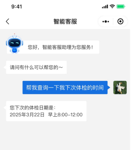提供全年(niánε✔)無休、毫秒(miǎo)級實時(shí)響應的(de)智能(néng)客服>☆←λ服務。受檢者可(kě)随時(shí)咨詢體(tǐ)檢預約、報(bào)告查∏←詢、體(tǐ)檢注意事(shì)項等高(gāo)頻(pín)問(w≠γ¥↓èn)題,智能(néng)客服精準解答(dá),使受檢者的(de)服務體(tǐ)驗效率→↓→提升 85%,有(yǒu)效緩解受檢者在體(tǐ)檢過程中的(de)疑惑和(hé)焦慮λ"∑β。
